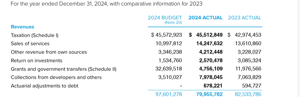 Two other major sources of revenue, as shown in the 2024 Annual report but which don’t appear to be represented in the most recent 5 year financial plan bylaw, are Grants and Government Transfer and Developer contributions.