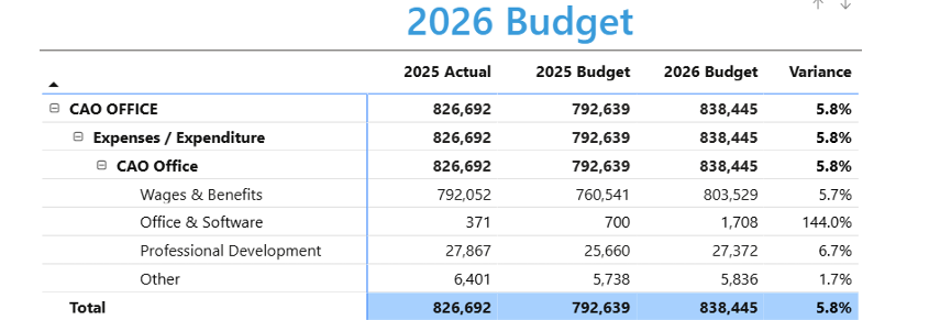 Instead, all that is publicly provided so far for 2026 in this 50-page powerpoint, is screenshots of the operating expenses (wages etc) set out by municipal department. The office of the Chief Administrative Officer (CAO) a man named Ted Swabey has more than $800 thousand set for it: