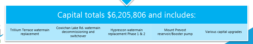 Now let’s move on to the Utility portion of the budget. The staff report provides a useful summary on water and sewer fees as individually set for each water and sewer provided across the municipality. The charges very depending on if you are in Chemainus, or Crofton, or Maple Bay, or the South End (ie. Duncan area). The report ends with this call to action: